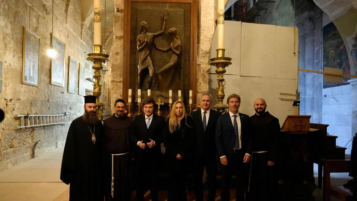 Entre las actividades destacadas, Milei visitó la Iglesia del Santo Sepulcro, donde rindió homenaje al Papa Francisco al cumplirse un año de su fallecimiento.